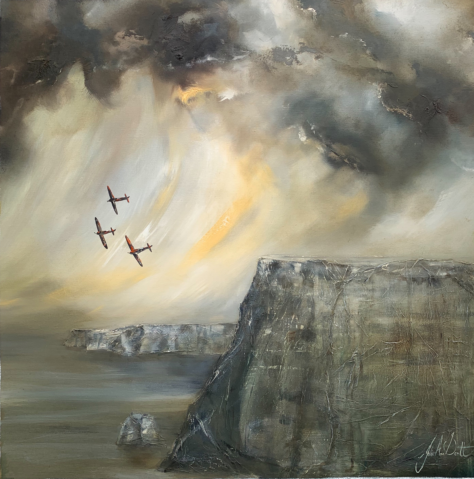 Young men fought in the air to create a wall of salvation for Britain. We must build this wall again, fighting in the heavenlies through total obedience to God and trusting in only His salvation through grace as our protection. The orange on the soaring SPITFIRES represents where the HOPE lies.